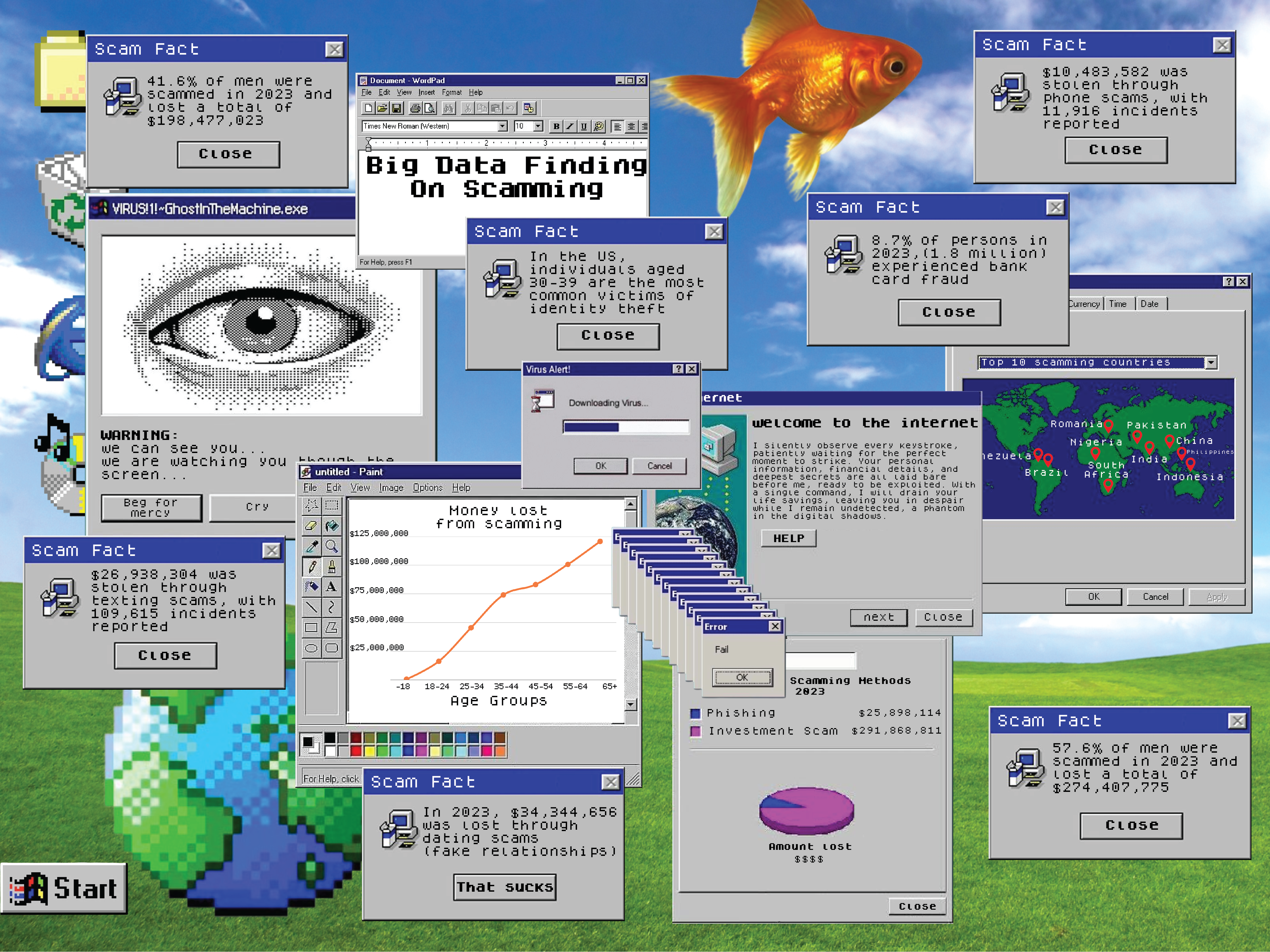 This early internet infographic design incoperates statistics on scams and the impact they have.