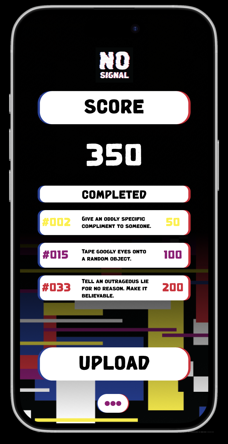 This branding projects is based on the concept of gamifying everyday life to create more fufilling moments away from the online world. To further take the users offline, the brand offers a deck of prompt cards full of side quests for users to complete at their own pace, or with friends in a multiplayer game through the No Signal app.